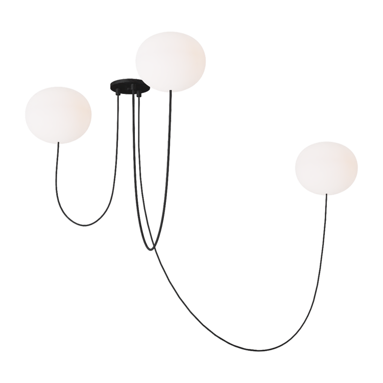 The Helium series by Peter Bristol is a modern family of lights that appear to be lighter than air. The slightly compressed spheres seem to push themselves against the ceiling, feeling like they might float away if they weren't tethered by their cables. From the elegant glass globes to the high quality draped cable, the Helium family is both visually and conceptually light. The hidden attachment and low profile canopy allow the perfectly draped cable and glowing glass elements to bring the playful, but elevated gestures to life.