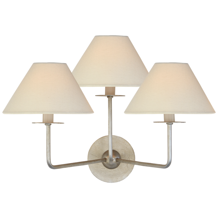 Kelley Medium Triple Sconce in Burnished Silver Leaf with Linen Shades Open Box