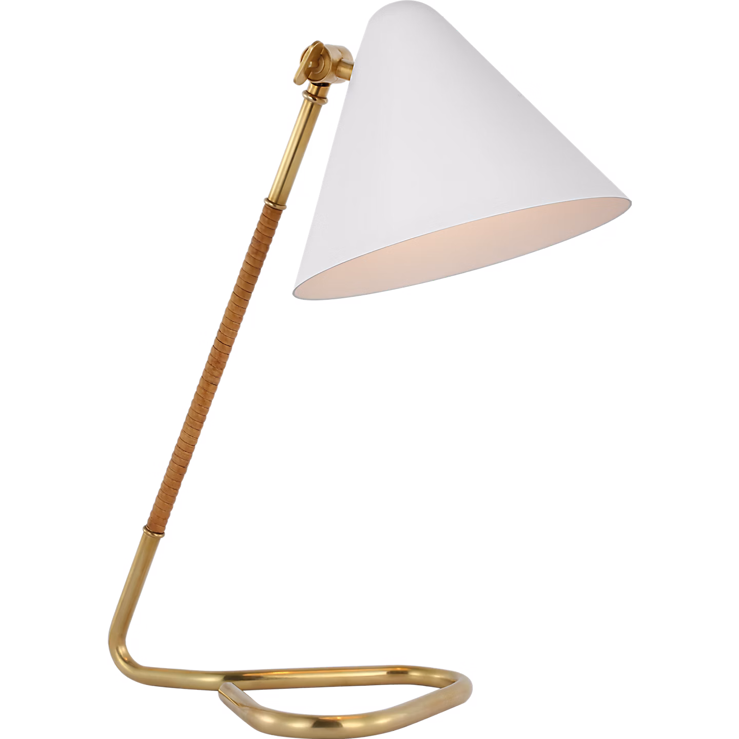 Laken Small Desk Lamp in Hand-Rubbed Antique Brass and Natural Rattan with White Shade