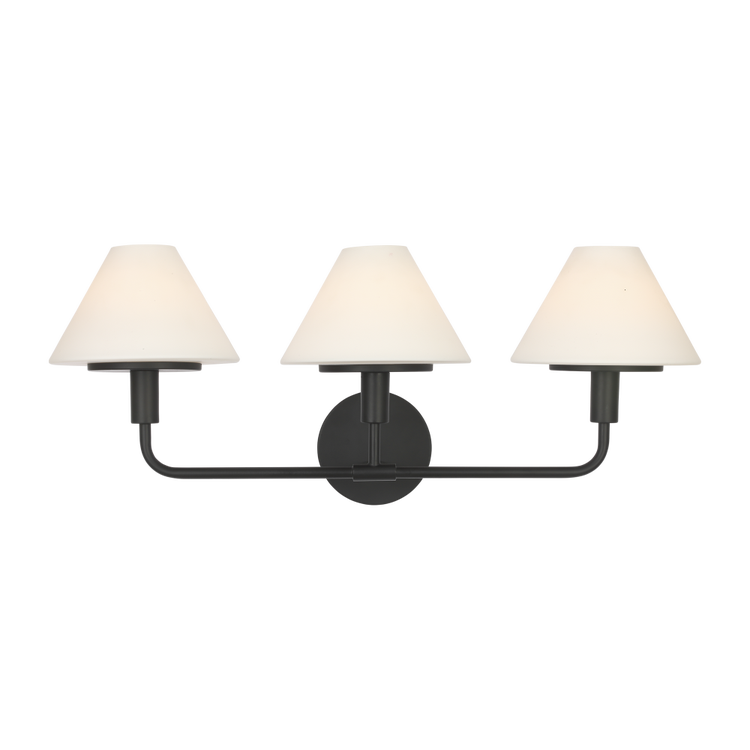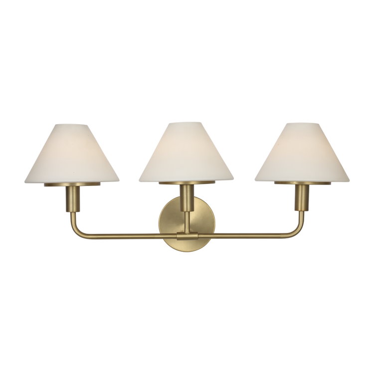 The Mendota Large Vanity uses three evenly spaced white glass cones on a structured armature, delivering ample light for primary baths or double-sink applications. Its linear design provides consistent output while maintaining minimal visual mass.