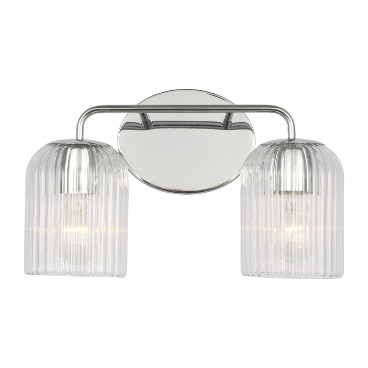 The Eisele Small Two-Light Vanity introduces curvature and texture to the bath environment through softly contoured forms and suspended ribbed glass shades. The oval backplate adds a distinct visual counterpoint, offering an updated silhouette that reinforces the collection?s softened geometry. With gently arcing arms and open glass diffusers, Eisele balances sparkle with control, providing functional illumination suited to powder rooms, guest baths, and primary suites.