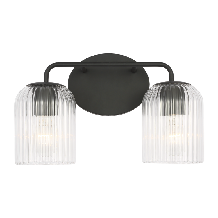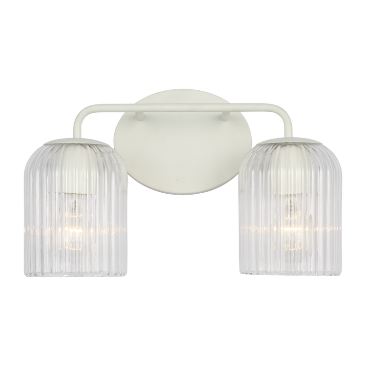 The Eisele Small Two-Light Vanity introduces curvature and texture to the bath environment through softly contoured forms and suspended ribbed glass shades. The oval backplate adds a distinct visual counterpoint, offering an updated silhouette that reinforces the collection’s softened geometry. With gently arcing arms and open glass diffusers, Eisele balances sparkle with control, providing functional illumination suited to powder rooms, guest baths, and primary suites.