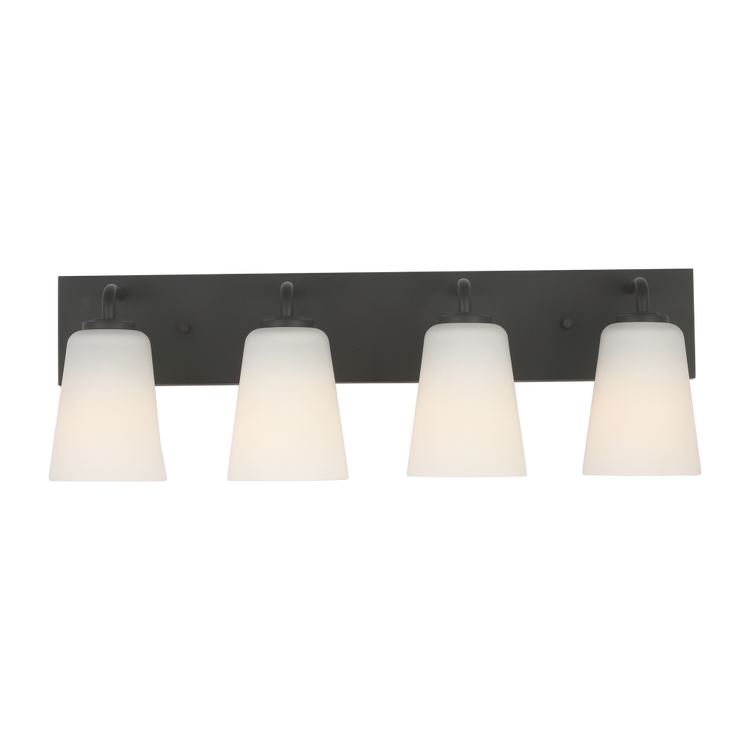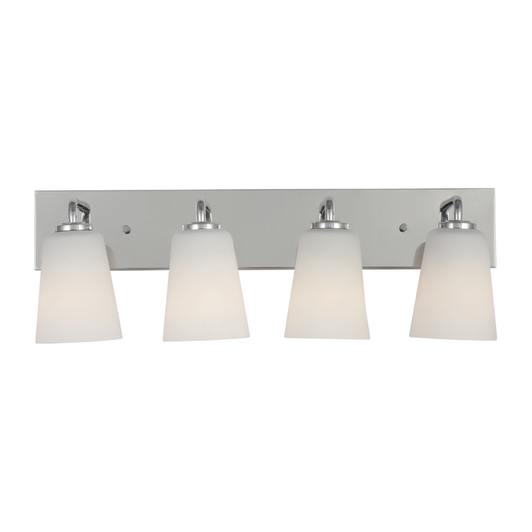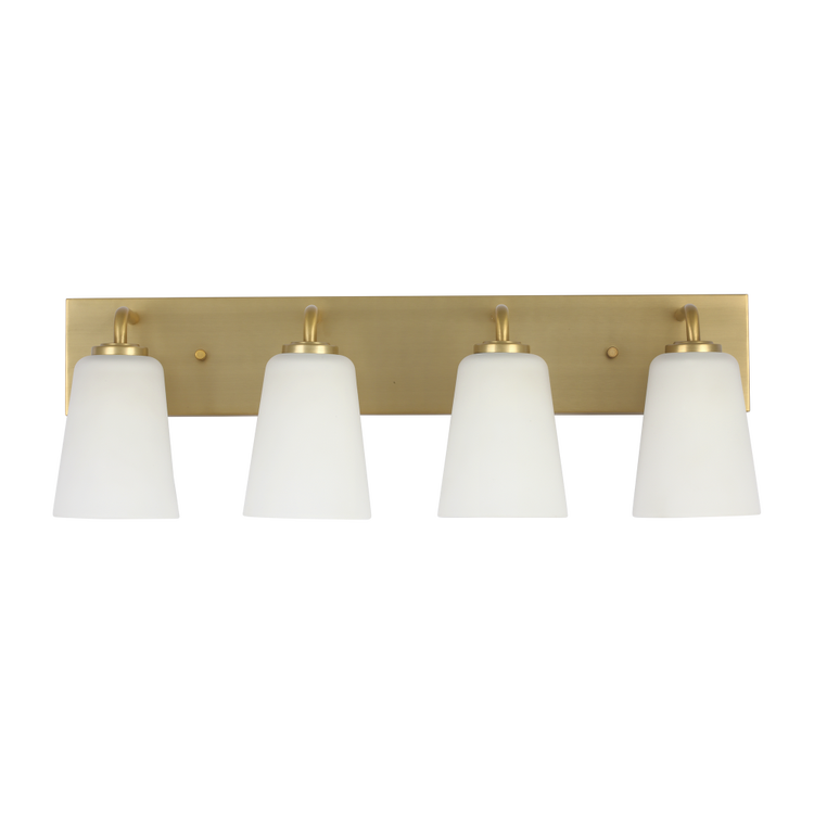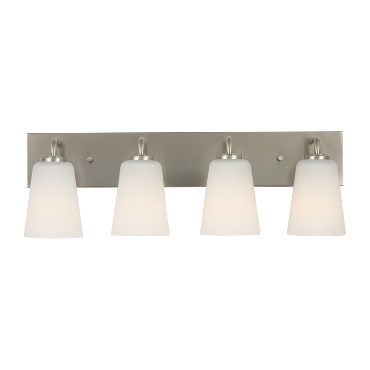 The Miles Four Light Vanity with etched glass offers softened distribution across four frosted diffusers. Its elongated form provides even coverage over large vanities, primary baths, or double sinks requiring diffused illumination. Miles effortlessly blends into a wide range of interior spaces?whether classic, contemporary, or traditional. Profiles are available as chandeliers, pendants, sconces, and vanities.