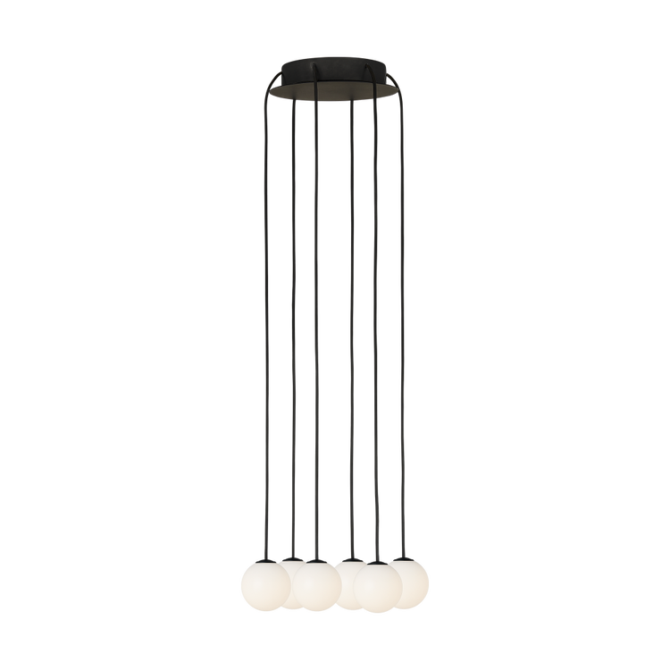 The classic pearl inspires the Orbet Trellis Chandelier by Sean Lavin with perfectly stacked milk glass orbs. LED illumination through milk glass provides a soft, diffused aesthetic, and a thin contrasting metal band accents each orb. Trellis represents modern, minimalist lighting in its purest form. Trellis offers incredible versatility, available as individual pendants or in conjunction with multi-port canopies to create a clustered chandelier. The multitude of canopy options ship with the cable attached which can be cut prior to fastening the quick-connect pendant, allowing for easy installation.?