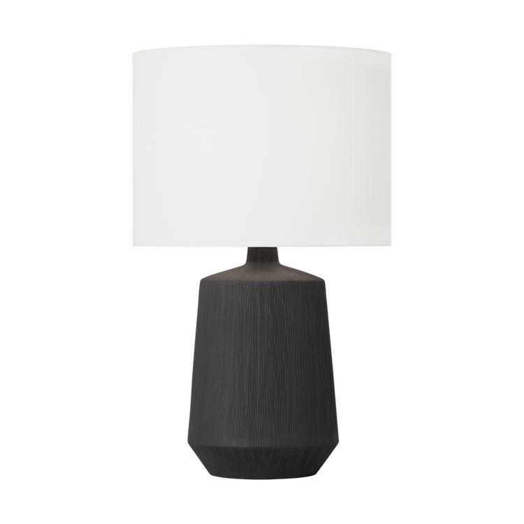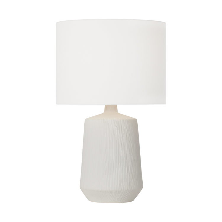 The Panola Medium Table Lamp is a striking, artful piece that enhances any space. Handcrafted in Matte Black or Matte White Ceramic with vertical etchings that accentuate the sculptural form. Its clean lines and minimalist appeal are complemented by a white linen drum shade that diffuses light softly. Brass detailing adds a subtle touch of warmth, enhancing its contemporary aesthetic. Dry-rated, the Panola Table Lamp brings a touch of tactile sophistication to your living room, bedroom, or office, making it a perfect piece for those seeking understated elegance.