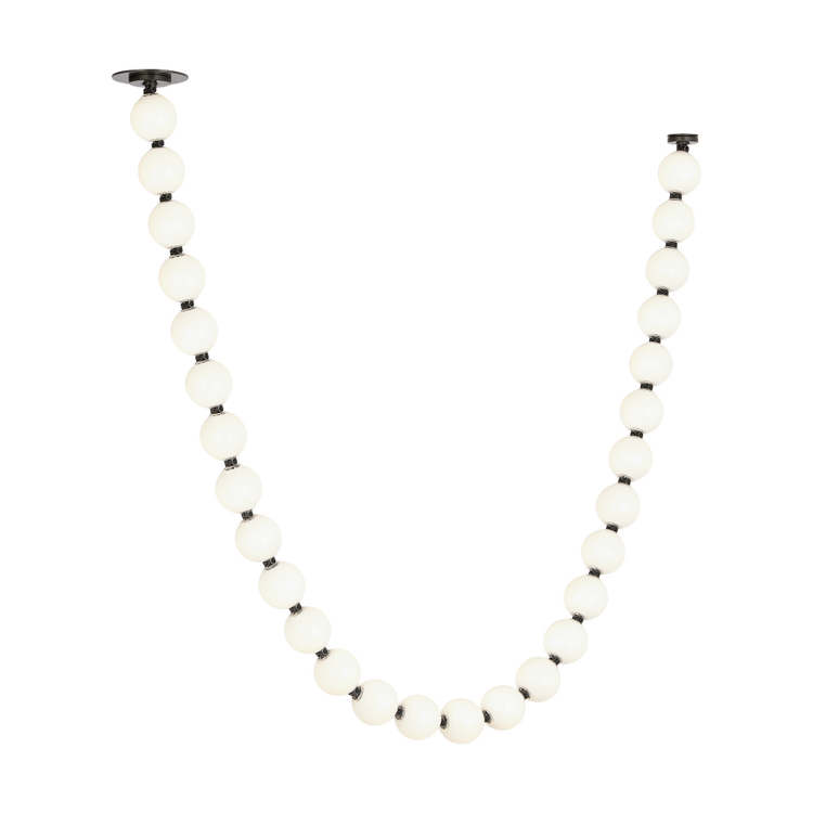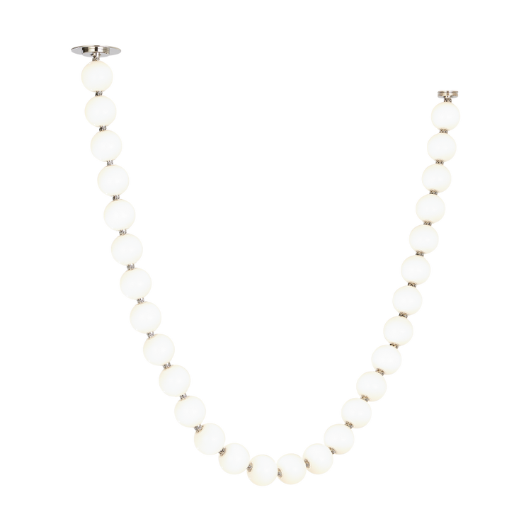 The Perle by Sean Lavin is a stunning extension to the popular Collier Series, now offered in soft white glass to provide a different design presence in a room. Available in multiple-length strands for the ultimate customization. Perle can be hung straight down in pendant form or draped from two mounting points for a striking chandelier utilizing the surface canopy or more minimal remote driver canopy. Interweave individual stands to create incredible light sculptures with stunning illumination. The natural brass connectors are custom engineered to support the glass and add additional beauty to the piece. Available with remote or surface-mounted driver options. Predetermined length options allow easy ordering with virtually unlimited versatility. Contact the factory for custom configurations. Patent pending.