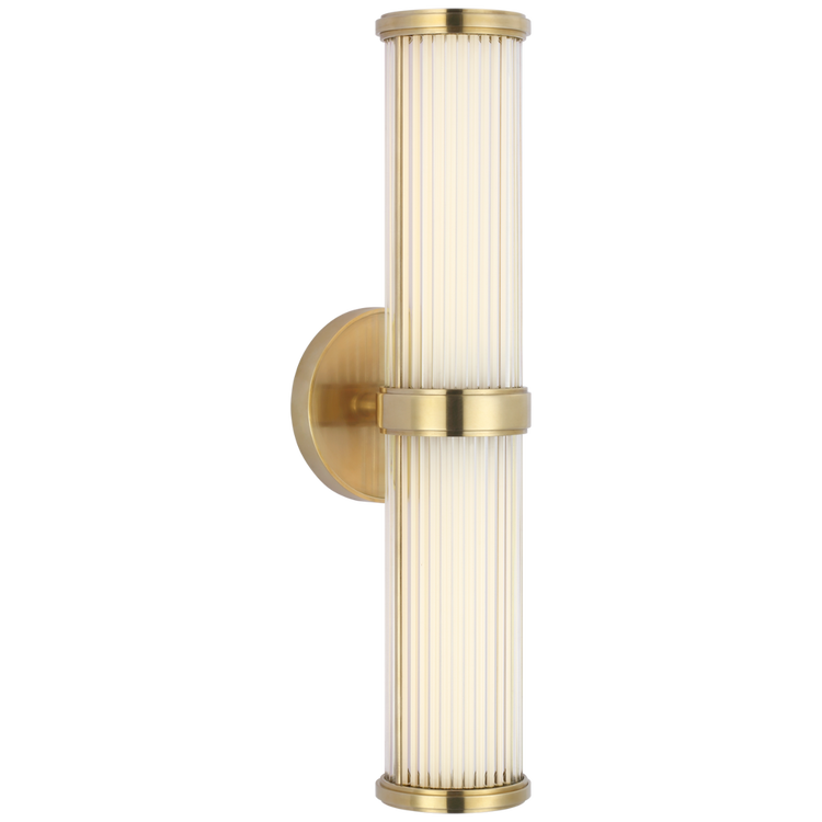 Inspired by the Allen series, the Ranier is a contemporary update of a modern classic from Ralph Lauren. Elegant metalwork houses glass rods as an elongated cylindrical shade, evenly diffusing light in pairs or multiples to enhance any bathroom with art deco appeal.
