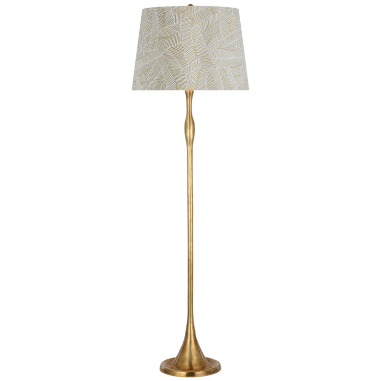 Romero Medium Floor Lamp in Hand-Rubbed Antique Brass with Schumacher 21" Taupe Abstract Leaf Flare Shade