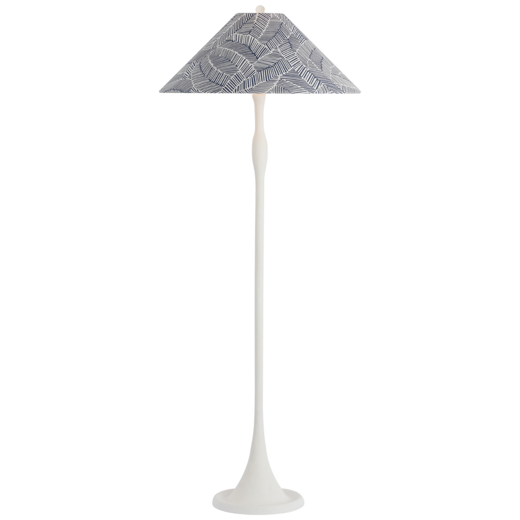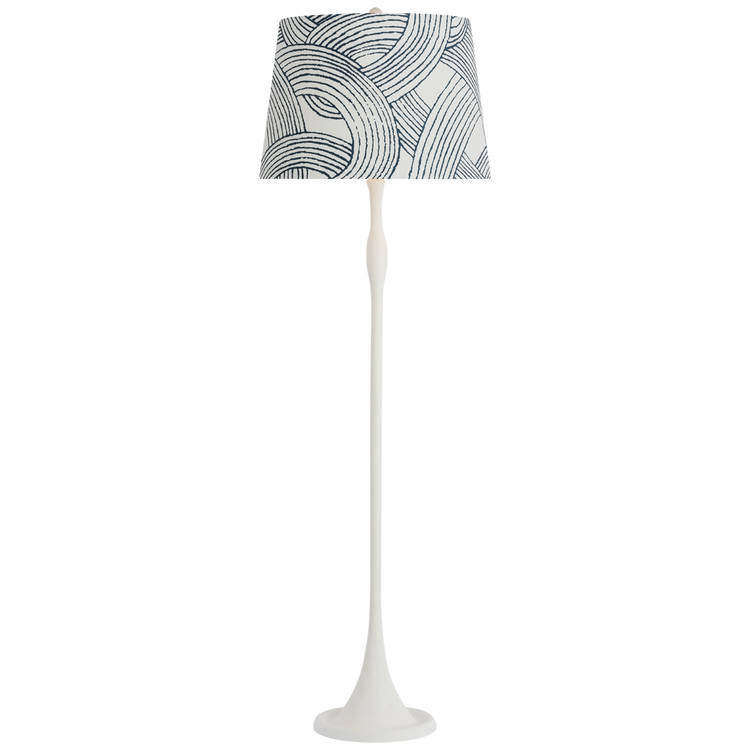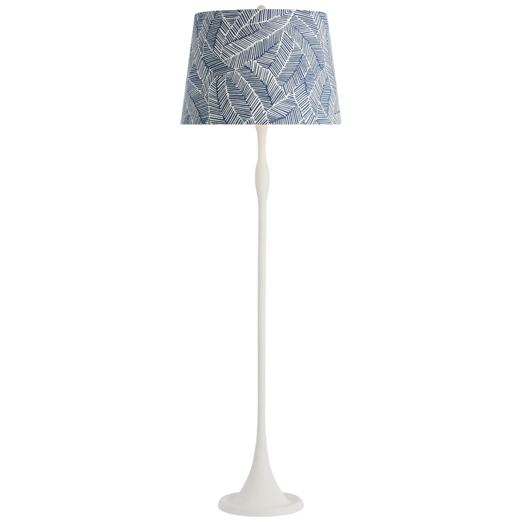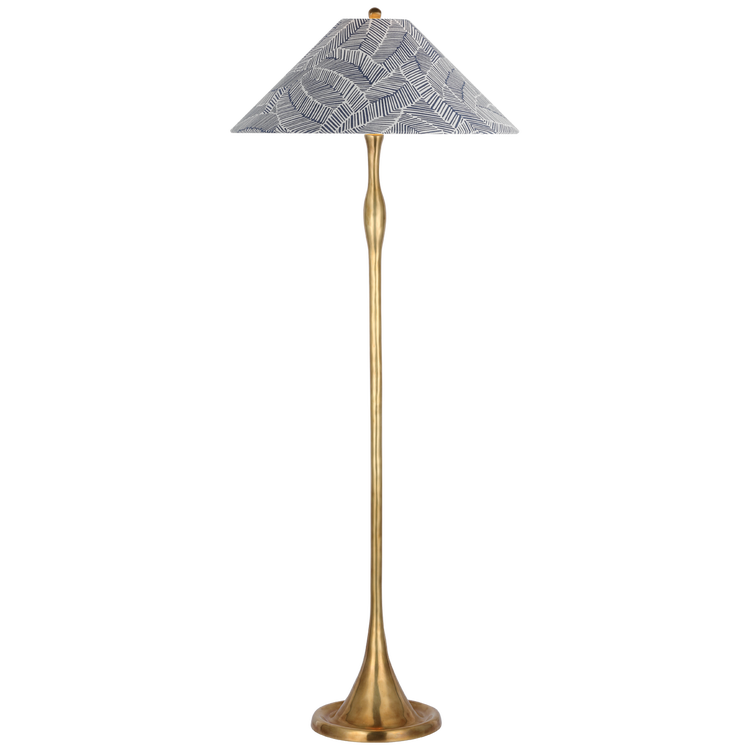 Romero Medium Floor Lamp in Hand-Rubbed Antique Brass with Schumacher 21" Navy Abstract Leaf Flare Shade