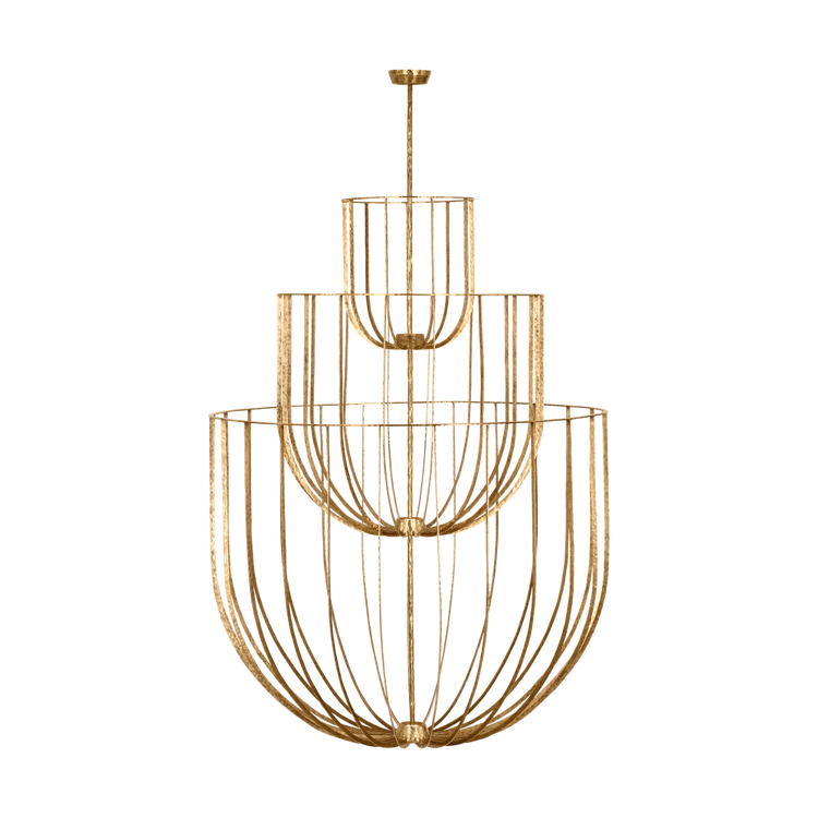 The Sanchi Grande Three-Tier Chandelier by Sean Lavin epitomizes Modern Lux. Each piece is meticulously hand-hammered by skilled craftsmen, infusing character and uniqueness into every detail. Witness the embodiment of craftsmanship that echoes through its grand scale. Radiate your space with an awe-inspiring glow that emanates from the interplay of light on the intricately hammered surface, creating breathtaking illumination.
