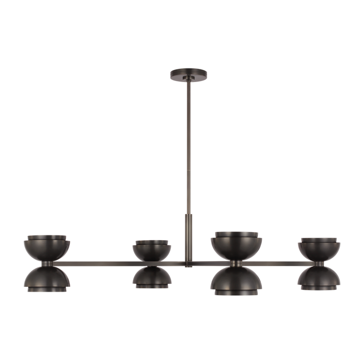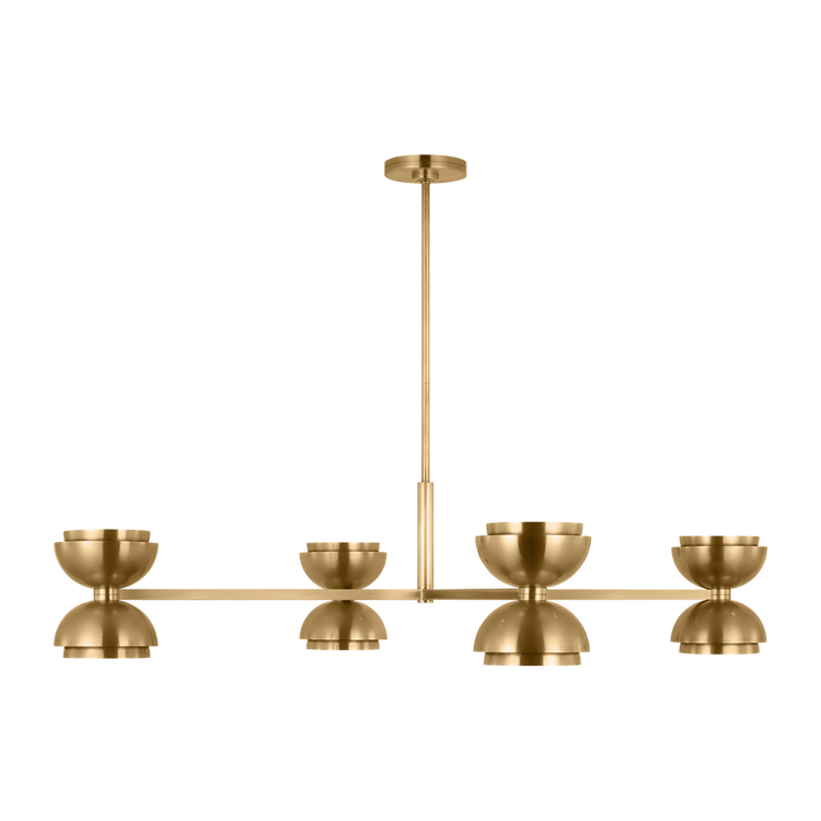 The Shanti X-Chandelier by Sean Lavin is a statement-making piece you'll want to set the tone in your foyer, living room, or dining room. The design presents a fresh visual you can indulge in from any angle you look at it. Hanging from the end of a simple stem is a set of large spun metal-shaped shades. Light sends the piece to another level as the multi-directional bulbs glaze the structure while creating a warm, radiant glow. Integrated LED modules bring the metal to life as they emit a bright and even layer of light through the top and bottom of the piece.